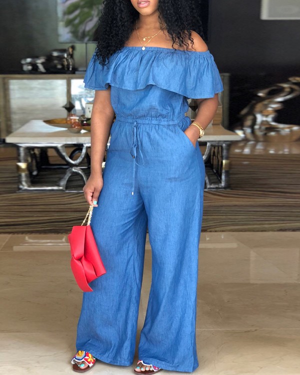 Off Shoulder Drawstring Wide Leg Denim Jumpsuit
